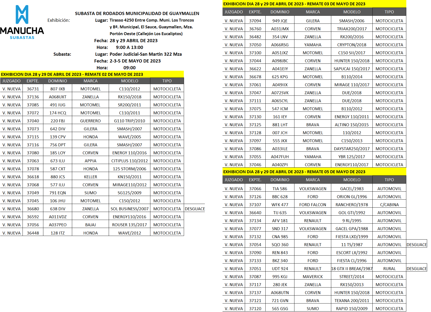 EXHIBICIÓN: 28 y 29 DE ABRIL DE 2023 DE 09:00 A 13:00 HS. REMATE: 02, 03 y 05 DE MAYO 2023 A LAS 09:00 HS.