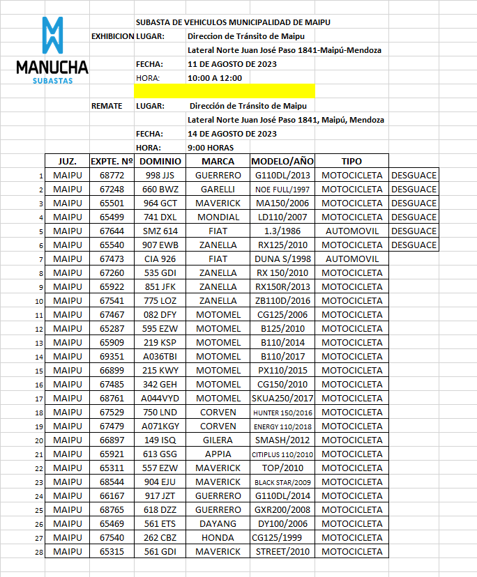 EXHIBICIÓN: 11 DE AGOSTO DE 2023 DE 09:00 A 17:00 HS Dirección de Tránsito de Maipu. Lateral Norte Juan José Paso 1841, Maipu, Mendoza.