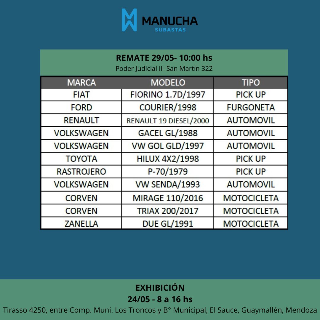 EXHIBICIÓN: 24 de Mayo de 2024 de 8:00 a 16:00 hs en: Tirasso 4250, entre complejo municipal Los Troncos y B° Municipal, El Sauce, Guaymallén, Mendoza de 08 a 16 horas. FECHA DE REMATE: 29 de mayo del 2024 a las 10:00 hs.