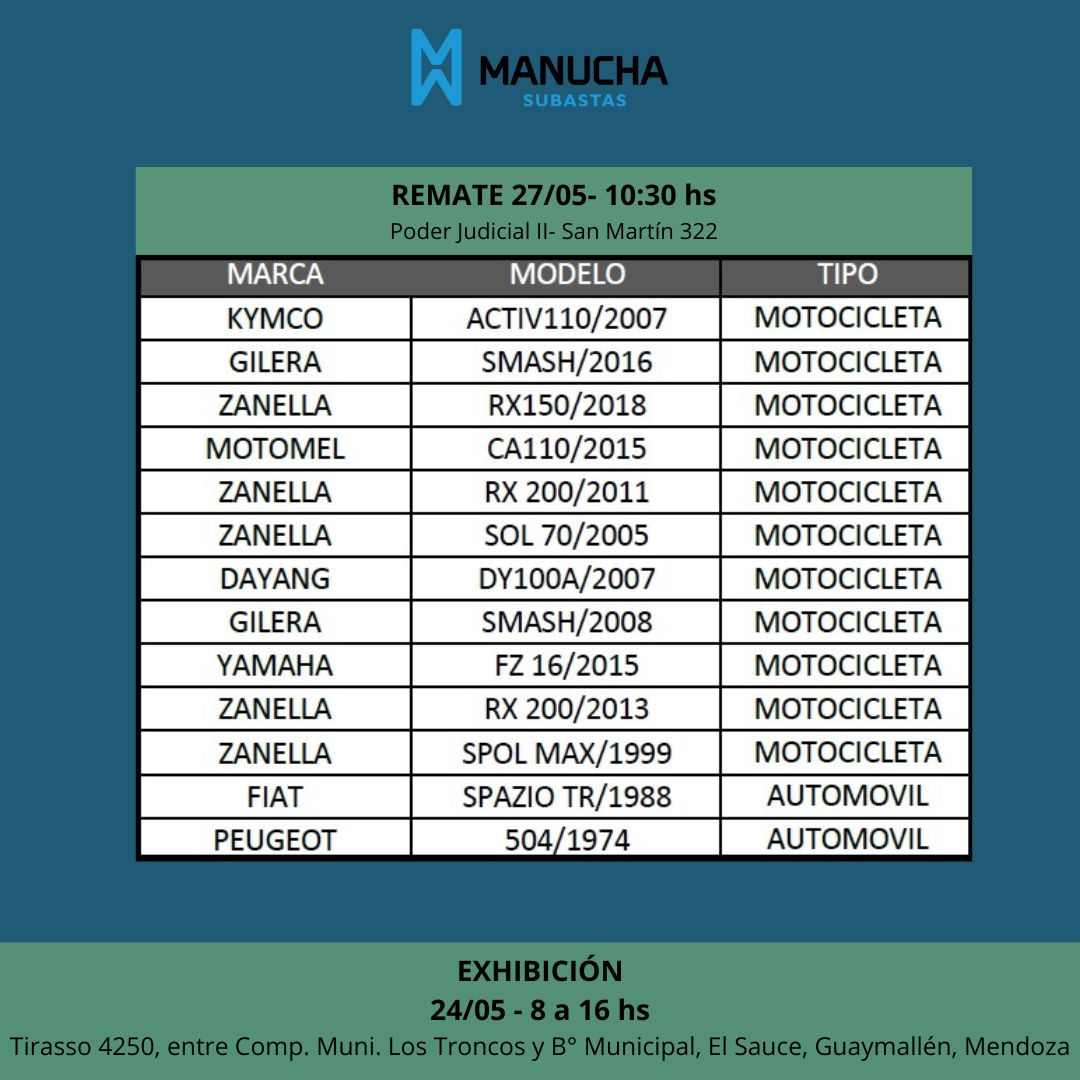 EXHIBICIÓN: 24 de Mayo de 2024 de 8:00 a 16:00 hs en: Tirasso 4250, entre complejo municipal Los Troncos y B° Municipal, El Sauce, Guaymallén, Mendoza de 08 a 16 horas. FECHA DE REMATE: 27 de mayo del 2024 a las 10:30 hs.