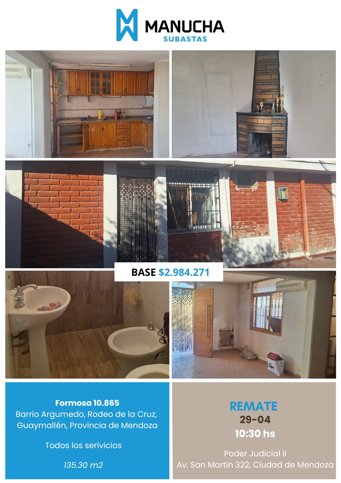 FECHA DE REMATE: 29 de abril de 2025. Cierre: 10:30 hs. Poder Judicial II, Av. San Martín 322, Ciudad de Mendoza.